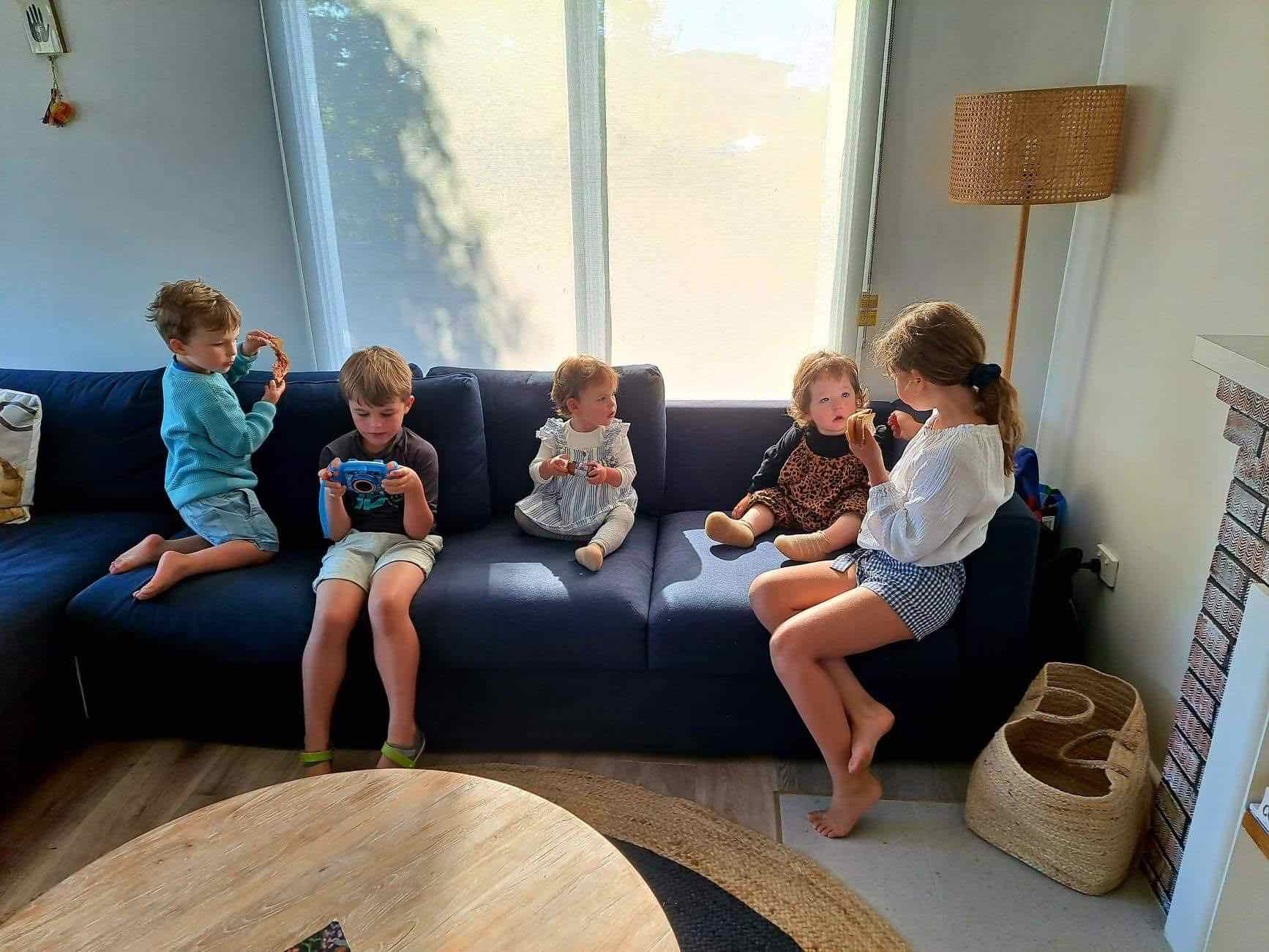 We all travelled to Sorento to a rented beach house to celebrate Linton’s 70th birthday. Photo shows Linton and Mandy’s five grand children. (L-R) Darcy, Luka, Violet, Hazel, Anouk.